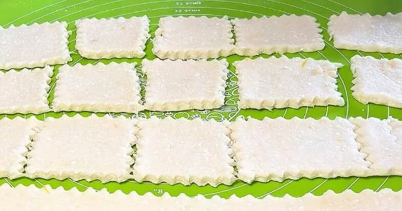Ділю на 2 частини, розкачую в прямокутник і зрізаю краї. Нарізаю на маленькі квадратики.