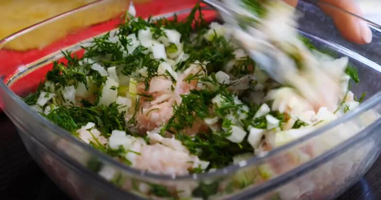 До курячого фаршу нарізаю дрібно цибулю, подрібнюю зелень, солю і перемішую.