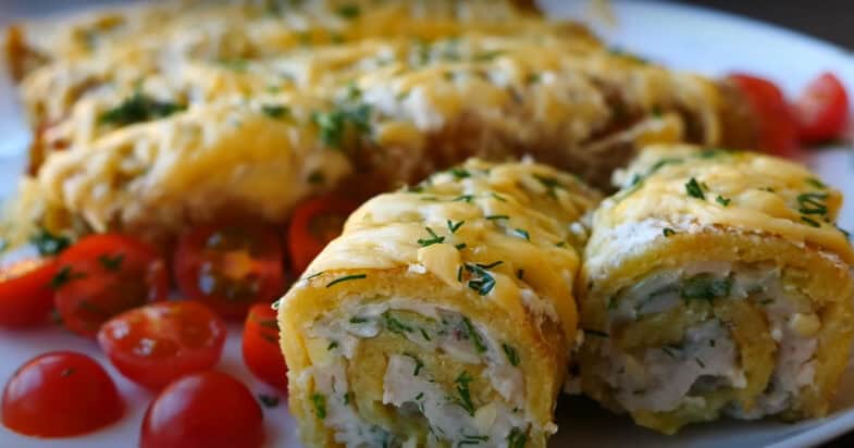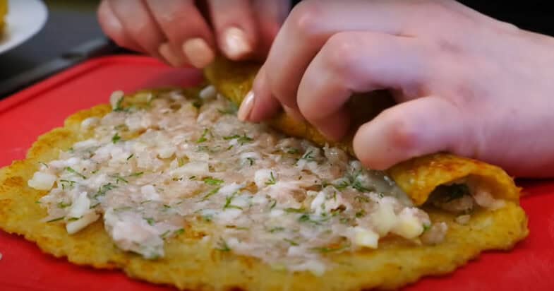 Викладаю начинку на деруни і закручую рулетиками.