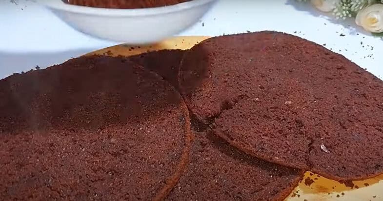 Корж охолоджую, зрізаю шапочку, яку перетворю на крихту для прикрашання. Розрізаю горизонтально на 3 частини.