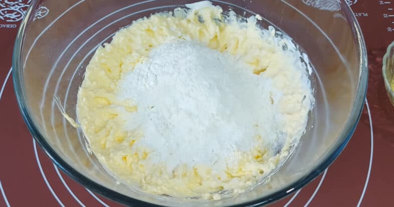 У два етапи додаю просіяне борошно, замішую тісто. Загортаю у харчову плівку, кладу до холодильника на 30 хвилин.