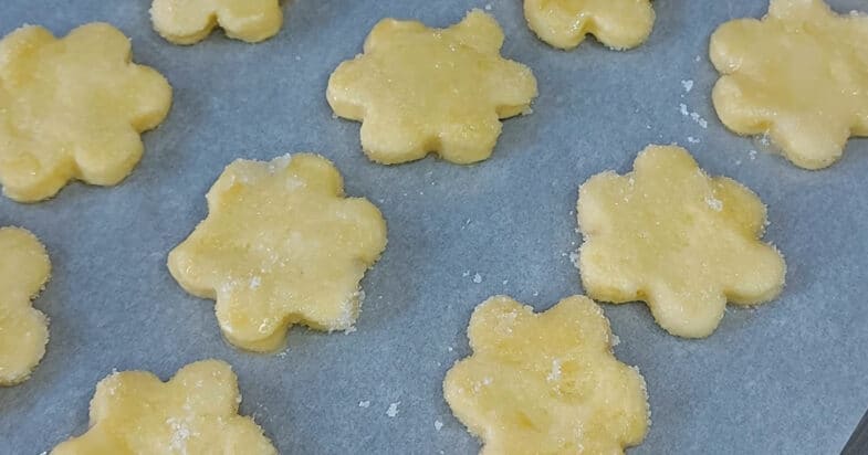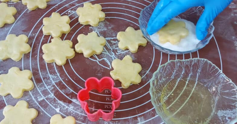 Вирізане печиво обмакую спочатку в білку, тоді панірую в цукрі.