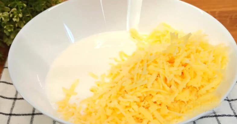 Наливаю в миску кефір. Кефір можна взяти одразу з холодильника, не гріти. Додаю сіль, соду, цукор і перемішую вінчиком. Сир натираю на крупній тертці і відправляю сир у миску з кефіром, перемішую.