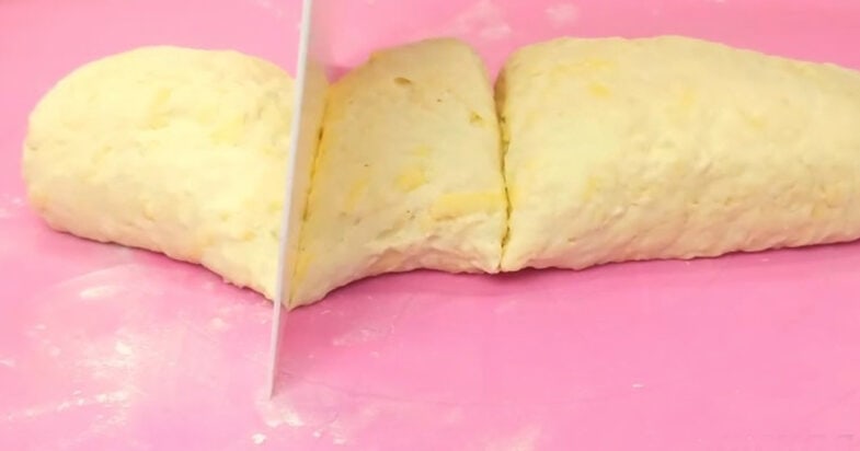 Просіюю борошно і замішую м’яке тісто. Довго його вимішувати не потрібно, буквально 2-3 хвилини. Тісто дуже ніжне, м’якеньке виходить. Ділю його на 4 частини.