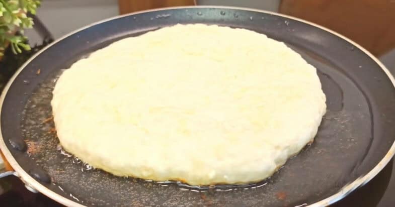 І тепер кожен шматочок тіста розгортаю в коржик товщиною близько 5 мм. Сковорідку ставлю на вогонь, наливаю олію і добре розігріваю.