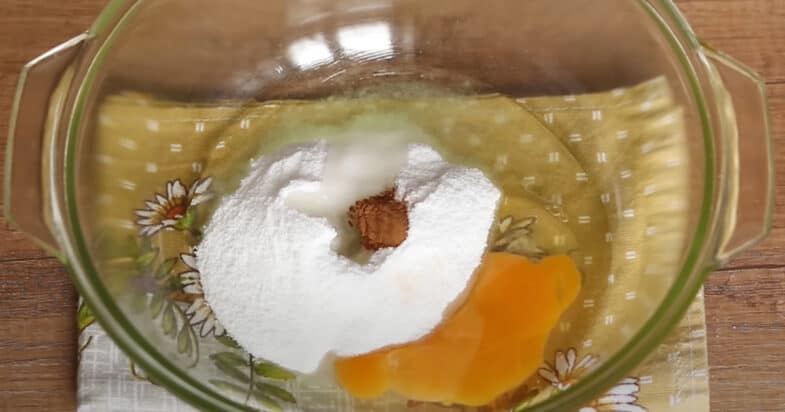 До яйця додаю цукрову пудру, сіль, олію, корицю і все перемішую до однорідної маси.
