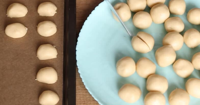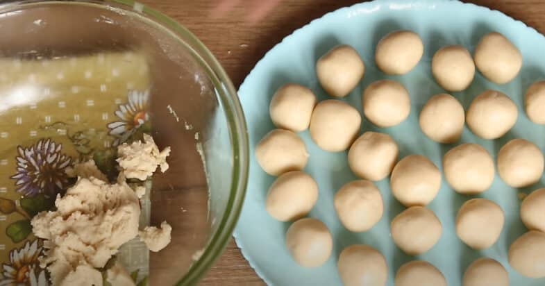 Від тіста відриваю маленькі кусочки і формую кульки. Вони мають бути розміром трішки менше, ніж волоський горіх. Накриваю харчовою плівкою та кладу у холодильник на 10-15 хвилин.