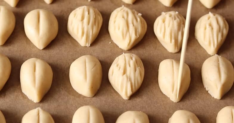 Один край майбутніх горішків звужую пальчиками. Зубочисткою малюю текстуру горішків. Накриваю харчовою плівкою та ставлю у холодильник ще на 10-15 хвилин. Випікаю у розігрітій духовці до 180 градусів приблизно 10-15 хвилин.