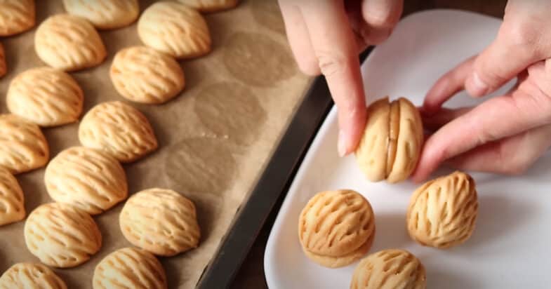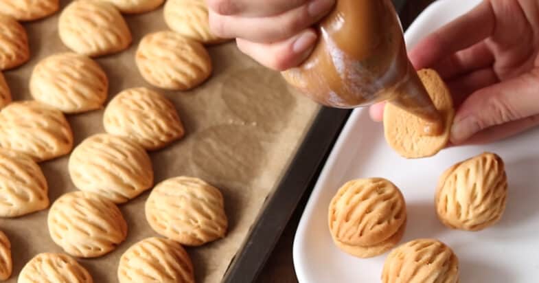 В кондитерський мішок кладу варене згущене молоко та начиняю одну частинку горішка.