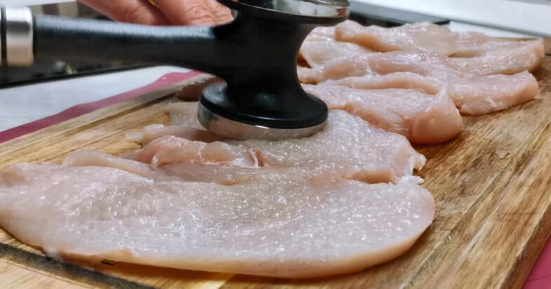 Куряче філе розрізаю вздовж на пласти. Філе краще взяти середнього розміру. Розрізане філе відбиваю молоточком із двох боків.