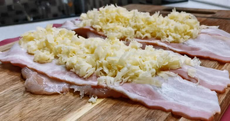 На кожен пласт кладу по дві смужки бекону, а на бекон кладу натертий на крупній тертці сир.