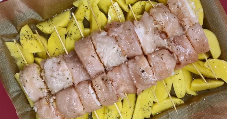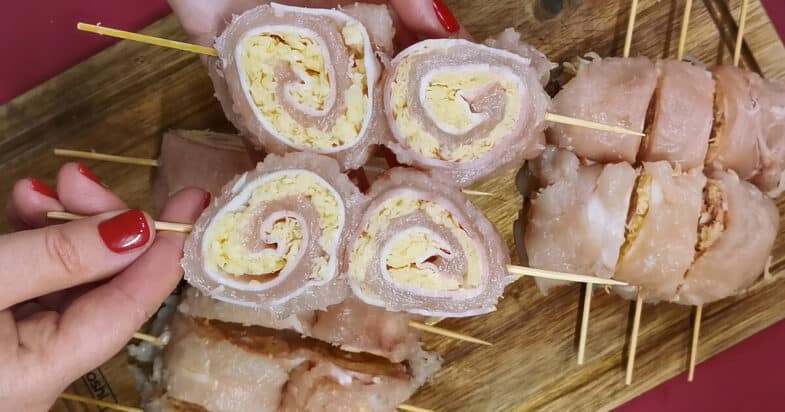 Загортаю філе щільними рулетиками і нанизую на дерев’яні шпажки.