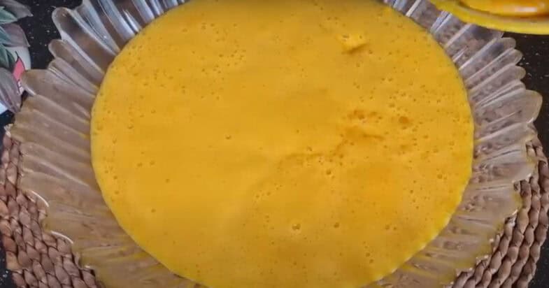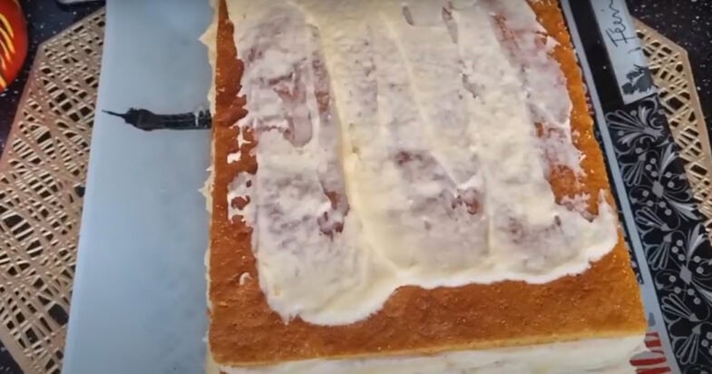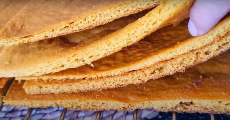 Прямокутну форму для запікання застеляю пергаментом, викладаю першу частину тіста, розрівнюю лопаткою. Відправляю у духовку при температурі 180-200 градусів до готовності бісквіту, випікаю таких 4 однакових. Бісквіти охолоджую, вирівнюю по краях, обрізки перетворюю на крихту для прикрашання. Розрізаю 4 бісквіти навпіл, отримую 8 .