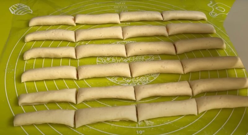 6. З’єднуємо краї тіста, закриваючи начинку всередині. Отримані «ковбаски» нарізаємо на невеликі трубочки й викладаємо їх на деко, застелене пергаментом.