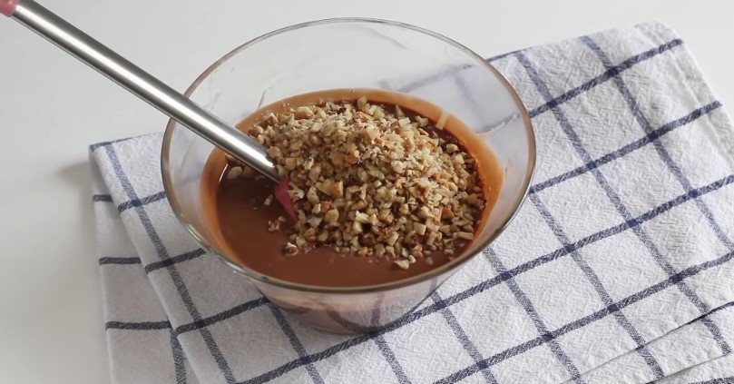 Готуємо глазур. У сотейник викладаємо молочний шоколад та олію без запаху. Підігріваємо, поки шоколад не розтопиться. Злегка обсмажуємо горіхи, подрібнюємо їх у крихту і додаємо до шоколаду. Ретельно перемішуємо.