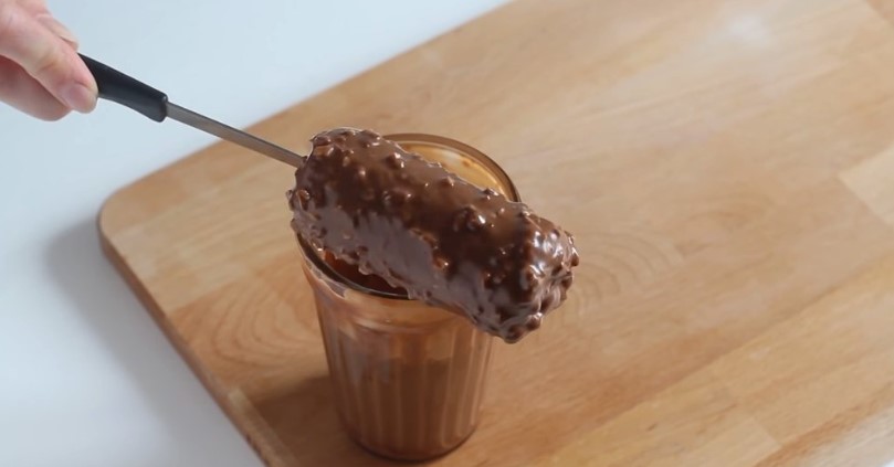 Переливаємо глазур у високу склянку. У застиглі сирки вставляємо ніж і почергово занурюємо в теплу шоколадну глазур. Даємо стекти залишкам шоколаду. Потім знімаємо сирки з ножа. Відправляємо їх у холодильник для стабілізації глазурі на 15-20 хвилин.