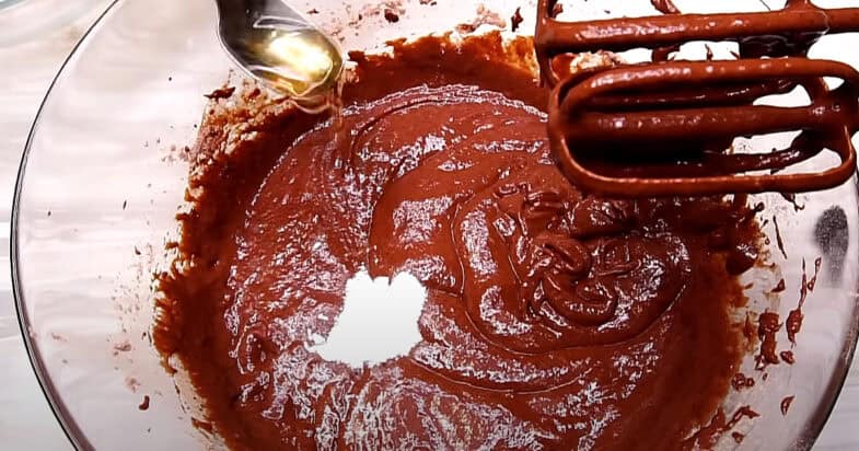 Змішую сухі інгредієнти: борошно, какао, розпушувач, цукор, ванілін, сіль. В окремій мисці замішую міксером чи вінчиком яйця з олією і молоком, вливаю окріп, перемішую. Додаю усі сухі інгредієнти, перемішую. Додаю соду і оцет, перемішую.