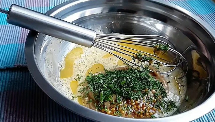 Залишилось приготувати гірчичний маринад. Змішати цукор з яйцем, а потім додати два види гірчиці – звичайну та у зернах.