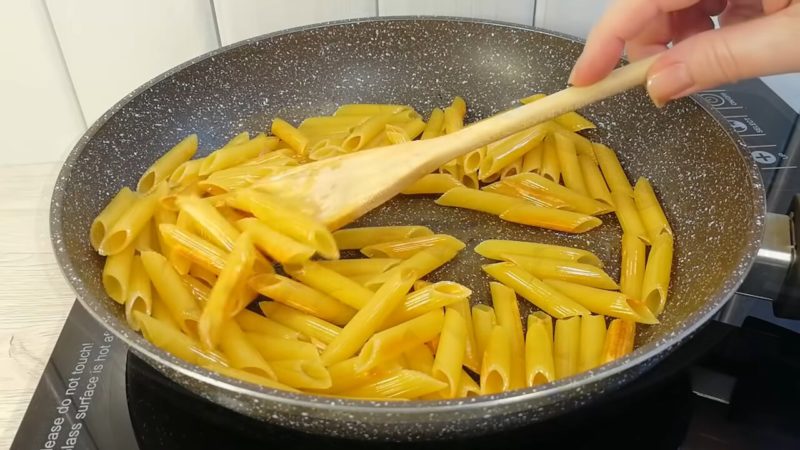 На сковороду наливаємо ложку рослинної олії. Насипаємо макарони й на середньому вогні обсмажуємо пару хвилин до появи золотистої скоринки. Цей трюк дозволить трохи підсилити й поліпшити смак макаронів, а також допоможе їм зберегти форму після приготування.