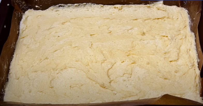 Деко застеляю папером для випікання і змащую олією. Розмір форми у мене 31 см на 23 см. Рівномірно розподіляю тісто і відставляю в сторону.