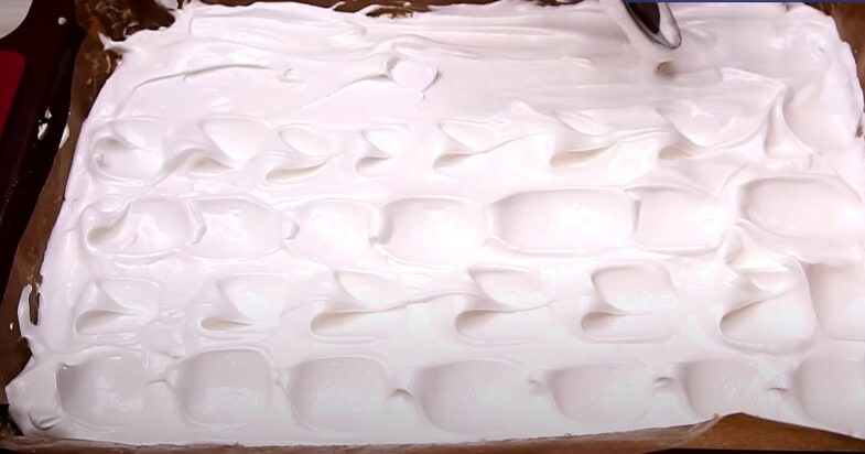 Кладу збиті білки зверху на сире тісто і розподіляю рівномірно. За допомогою ложки роблю візерунок.