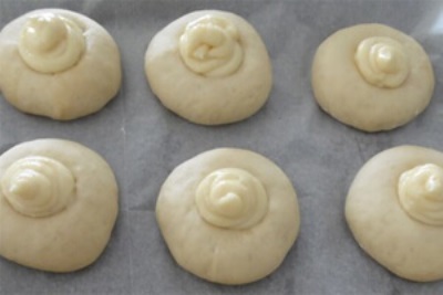Беремо тісто і ділимо на шматочки 60-65г. Скачуємо кожен в кульку. Трохи натискаємо пальцями й в середині робимо поглиблення для крему, даємо 20хв на підйом.