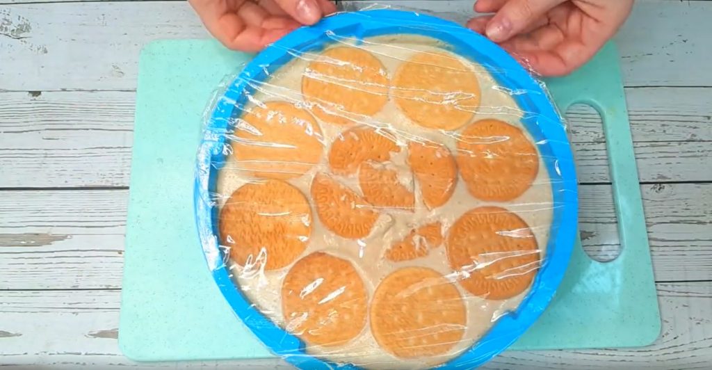 6️⃣ Формуємо основу – кожне печиво занурюємо в молоко, викладаємо поверх застиглого шару.