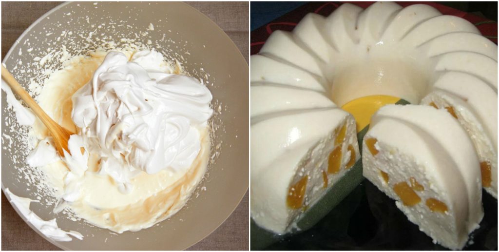 - Під час збивання білкової маси тонкою цівкою влийте молоко з желатином та залиште для охолодження.
