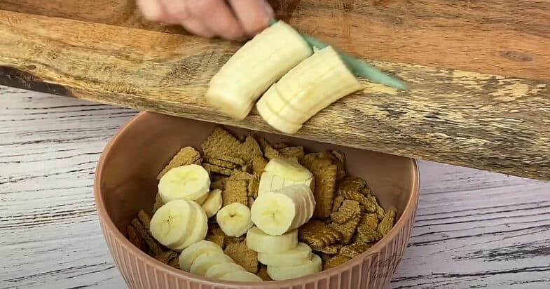 Банани нарізаю кружечками, печиво ламаю руками шматочками.