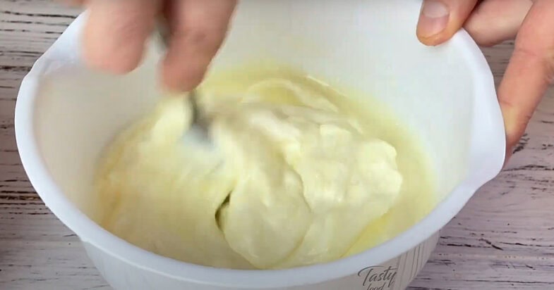 Розтоплюю желатин водою, залишаю набухати. В окремій мисці змішую сметану з згущеним молоком, тоді додаю розтоплений желатин, перемішую.