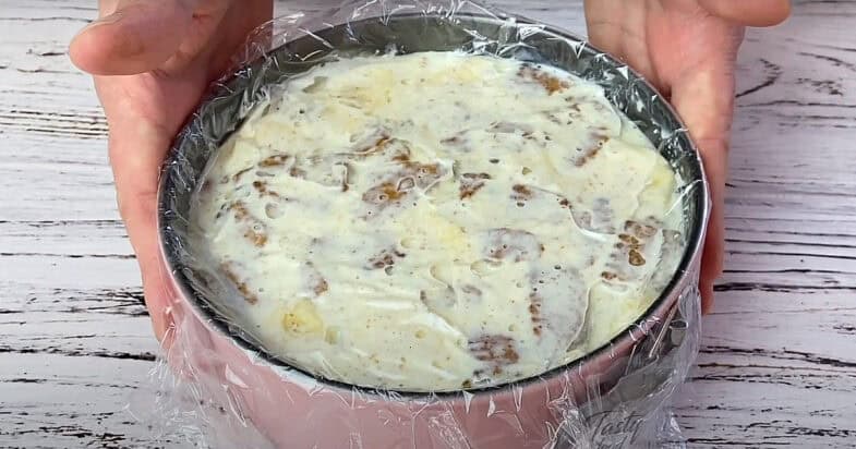 Змішую масу з печивом та бананами. Форму роз’ємну діаметром 18 см застеляю харчовою плівкою, викладаю усю масу. Зверху накриваю ще плівкою і відправляю у холодильник на 5-6 годин.