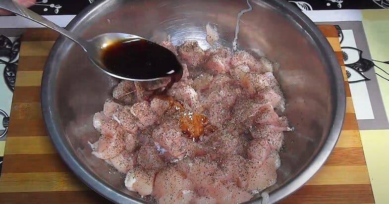 Куряче філе нарізаю кубиками, солю, перчу за смаком, додаю соєвий соус, перемішую. Залишаю на декілька хвилин промаринуватись.
