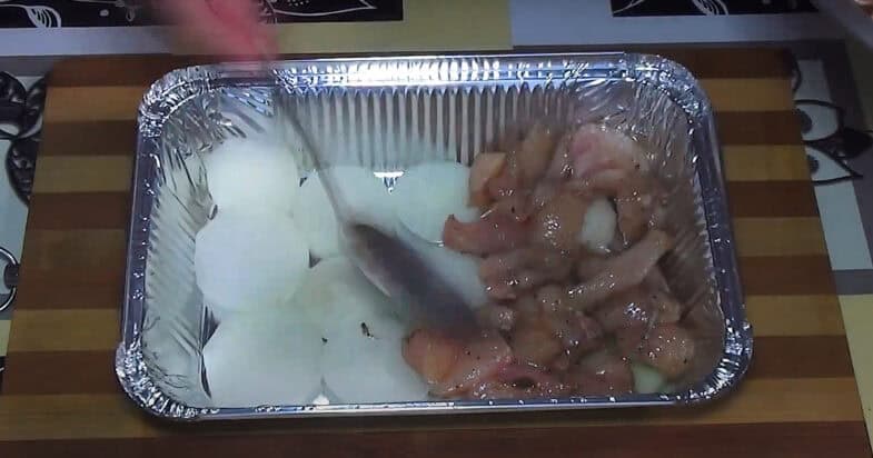 Для запікання сьогодні беру одноразову форму для випічки, змащую її олією, на дно нарізаю цибулю кружечками, поверх викладаю усе філе.