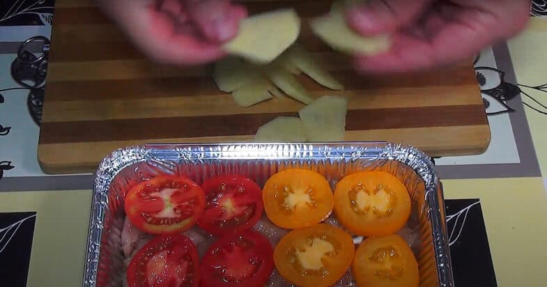Зверху кладу помідори кружечками і картоплю порізану тоненькими кружечками.
