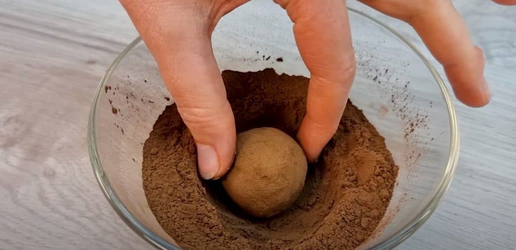 Беремо по чайній ложці отриманої маси, скачуємо кульки і обвалюємо їх в какао.
