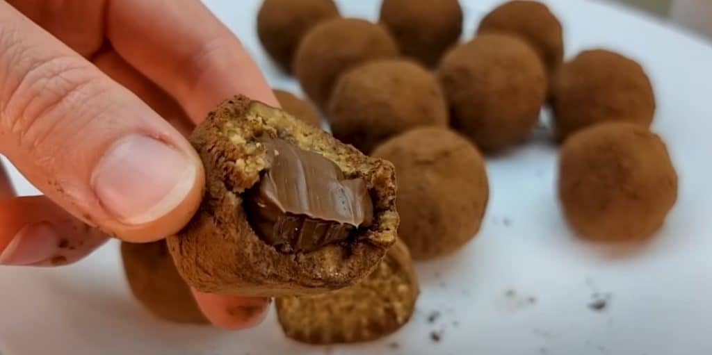 Щоб зробити цукерки з начинкою, з маси робимо коржик, всередину видавлюємо трохи шоколадної пасти за смаком і формуємо кульку. Обвалюємо в какао.