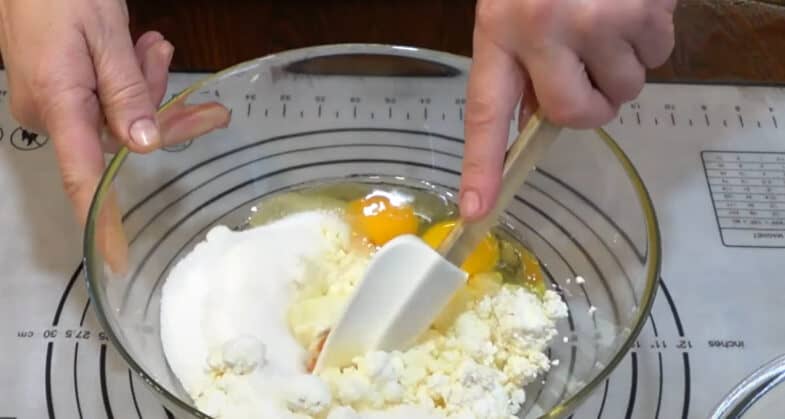 Начинку для млинців буду робити з сиру, яєць, цукру та ванільного цукру. Усі ці інгредієнти перемішую.