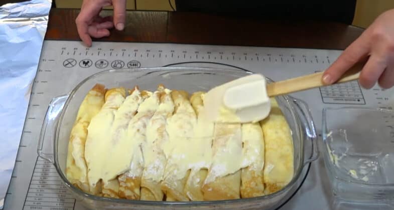 У форму викладаю млинці та змащую маслом. Накриваю форму фольгою та відправляю у духовку розігріту до 180 градусів на 30 хвилин.