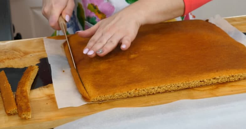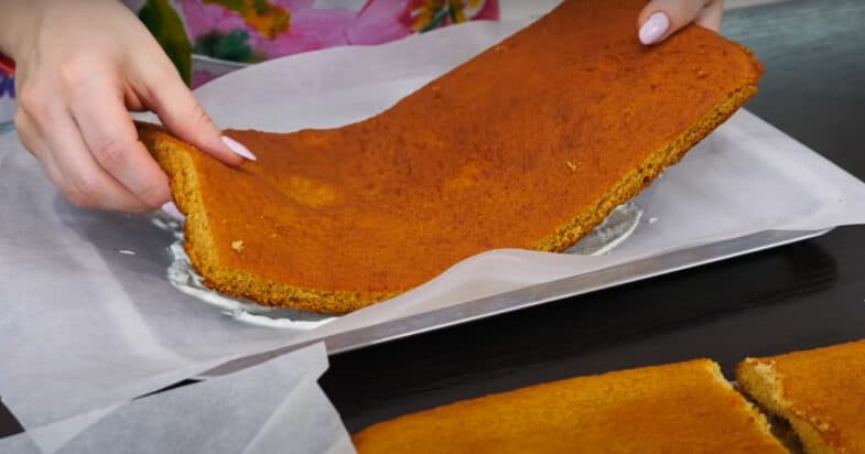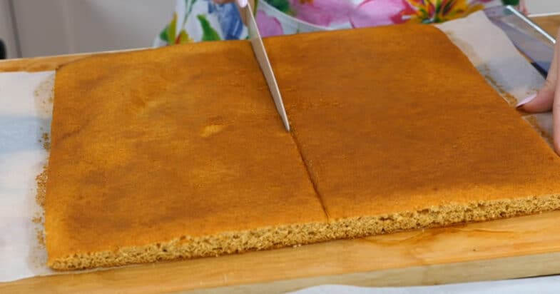Розрізаю корж наполовину. У мене вийшло 4 рівних штуки.