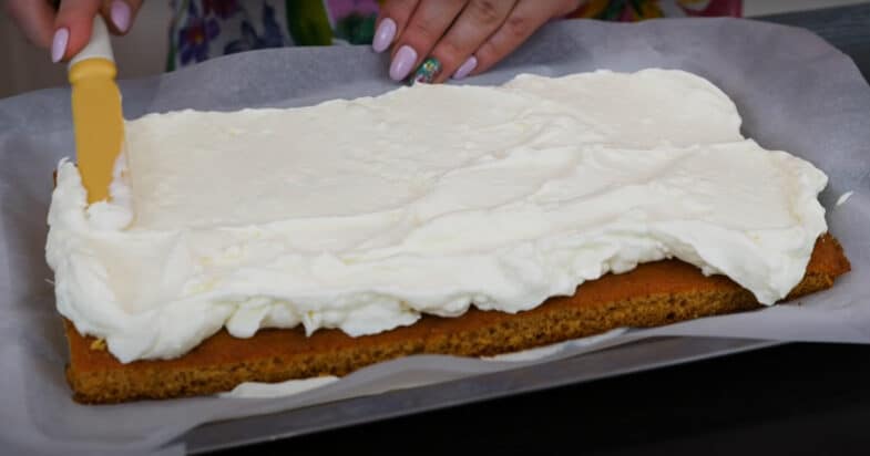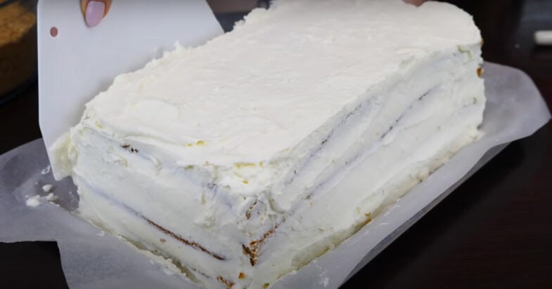 Змащую кремом повністю увесь торт, зверху та на бортиках.