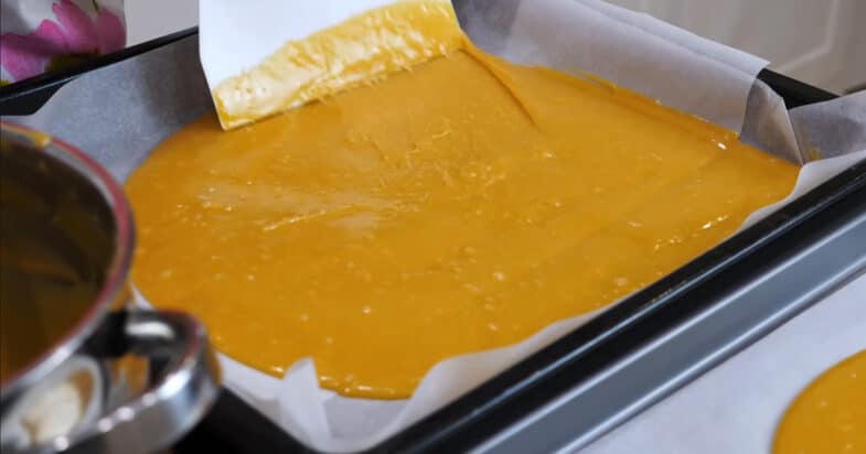 На форму застеляю пергамент, виливаю та розрівнюю масу. Я випікаю таких два коржа на однакових формах. Відправляю у духовку 180 градусів, приблизно на 5-8 хвилин, дуже швидко випікаються коржі.