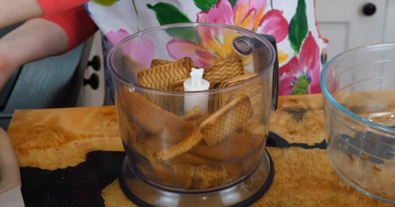 В блендері до крихти подрібнюю краї коржів з печенням.