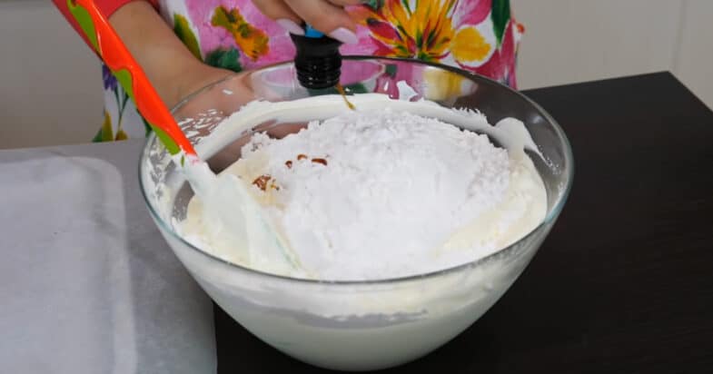 Роблю крем, до сметани додаю цукрову пудру, ваніль та згущувач для сметани, перемішую.