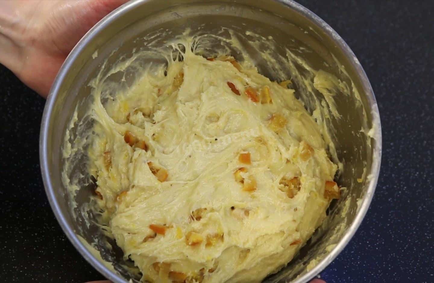 Змішайте всі інгредієнти, крім цукатів та вершкового масла і замісіть тісто хвилин 5-7 на мінімальних обертах. Це можна зробити як тістомісом, так і руками. Воно буде рідкуватим і, якщо можна так сказати, трохи гумове. Борошна може піти більше чи менше, орієнтуйтесь на консистенцію тіста.
