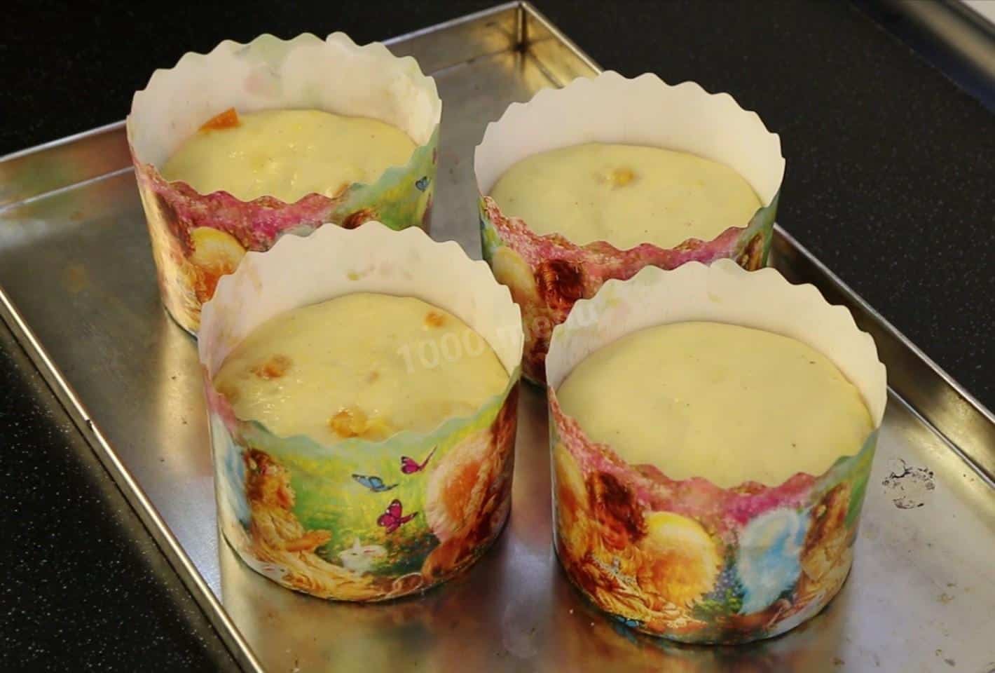 Розділіть на 4 рівні частини, кожна по 280 г, форми потрібно заповнити на 1/3 і заберіть на вистоювання в тепле місце.