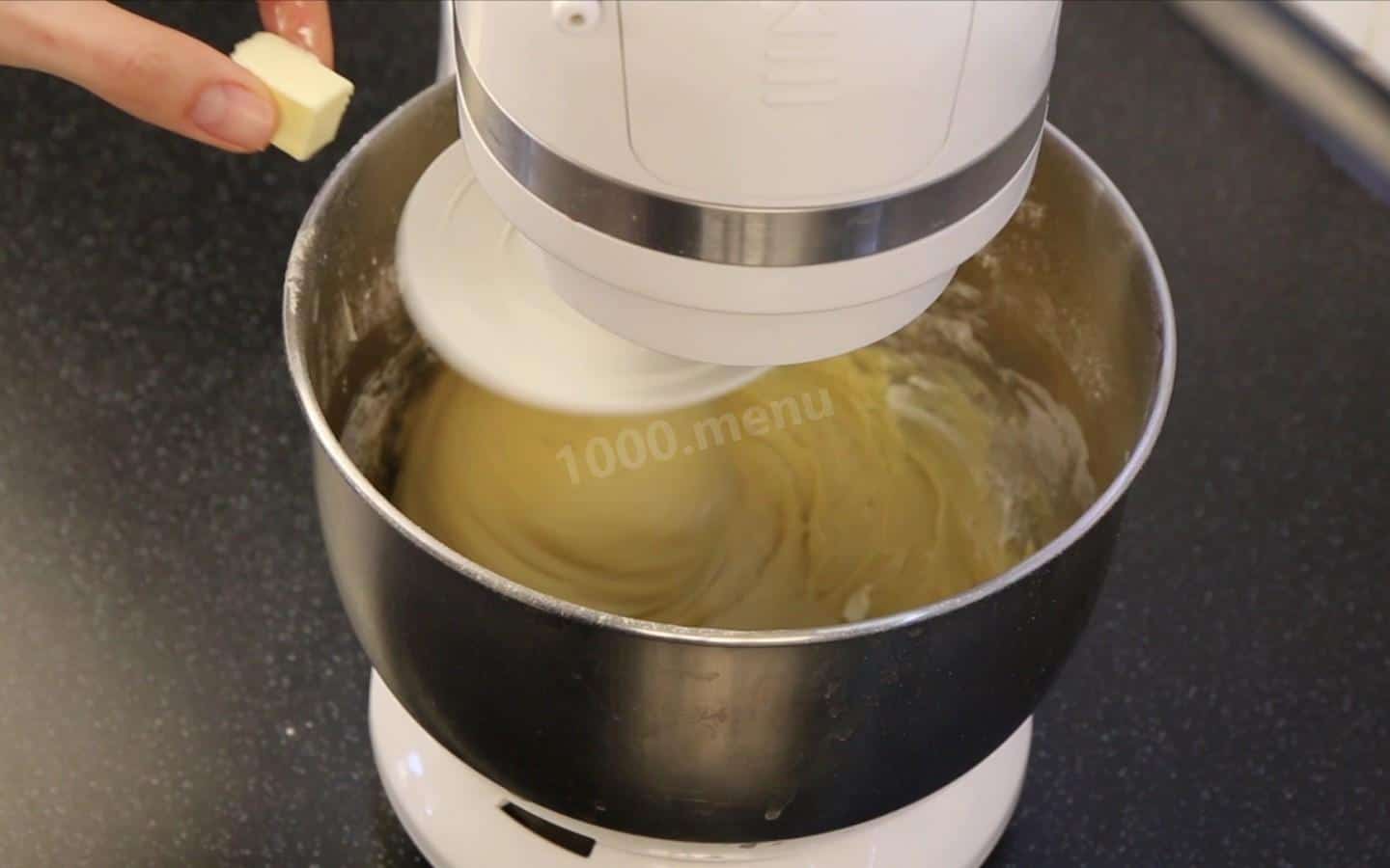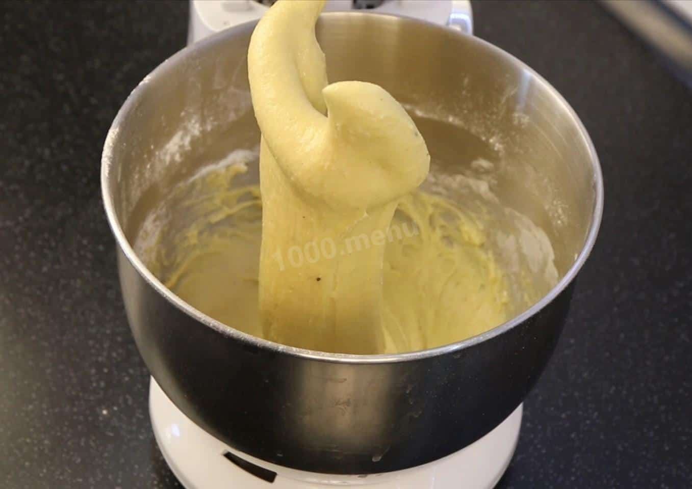Потім невеликими кубиками додавайте холодне вершкове масло з інтервалом 15-20 секунд. На це може піти 10 хвилин. І продовжуйте вимішувати тісто далі. Воно буде змінюватися, стає еластичним і можна буде помітити, як воно почне десь відходити від стінок чаші.