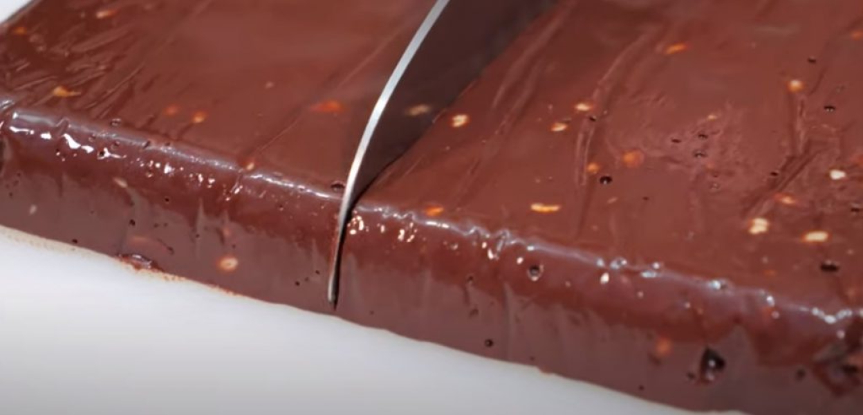 6. Подача: Коли десерт повністю застигне, акуратно вийміть з форми, зніміть пергамент, наріжте на порційні квадратики за допомогою сухого гарячого ножа.