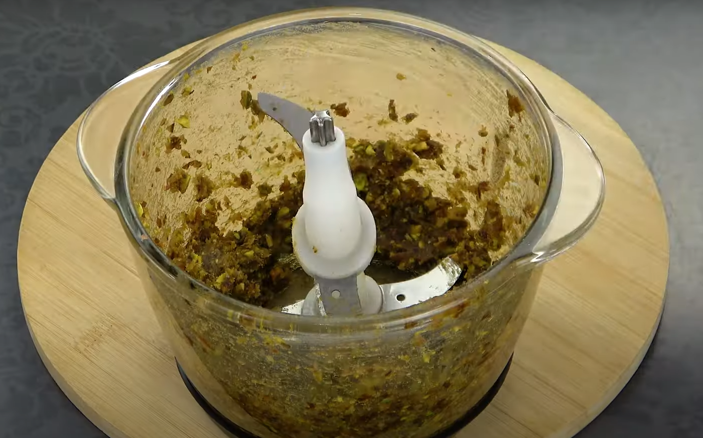 У блендер помістіть очищені фісташки, додайте фініки і подрібніть до однорідної маси.