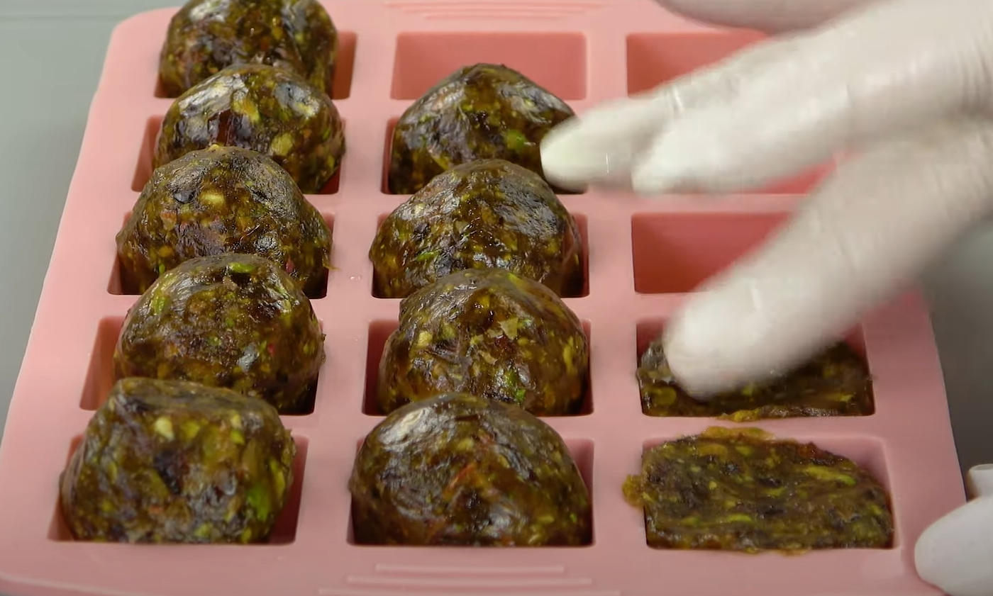 Змастіть руки оливковою олією і сформуйте з маси маленькі кульки. Викладіть їх у силіконову форму і розрівняйте.