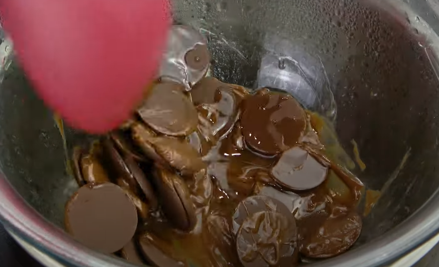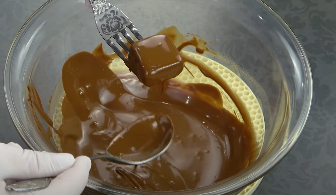 Помістіть форму в морозилку на 30-40 хвилин. Тим часом розтопіть шоколад на водяній бані з додаванням олії.
